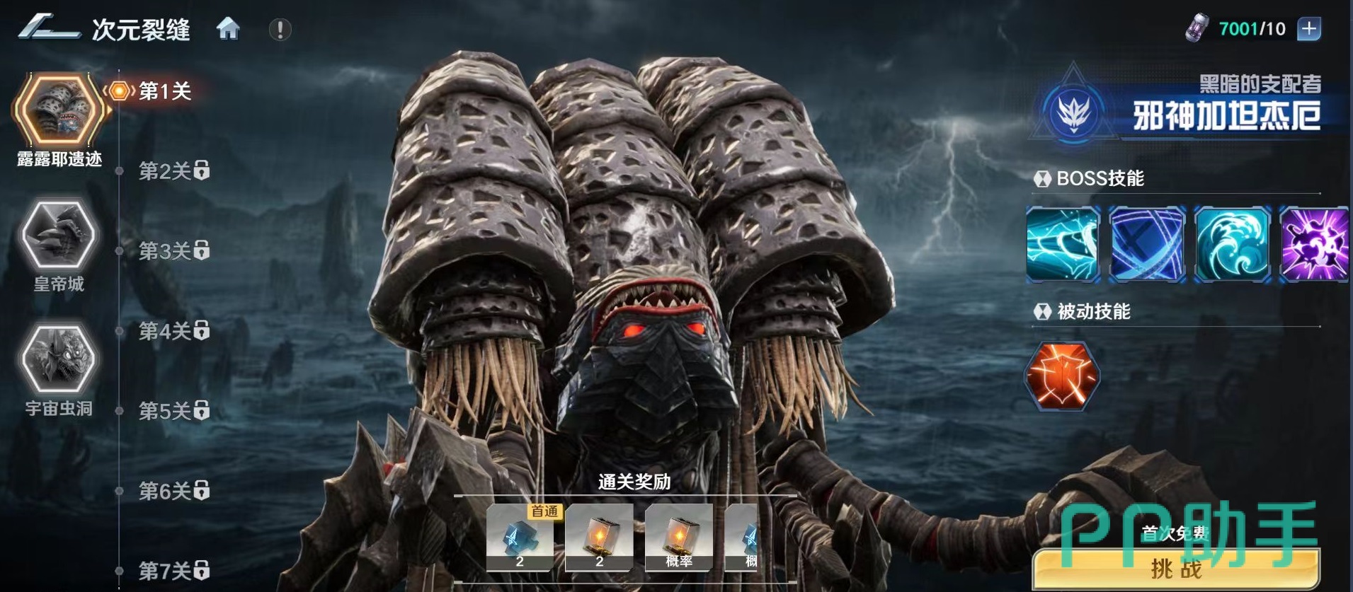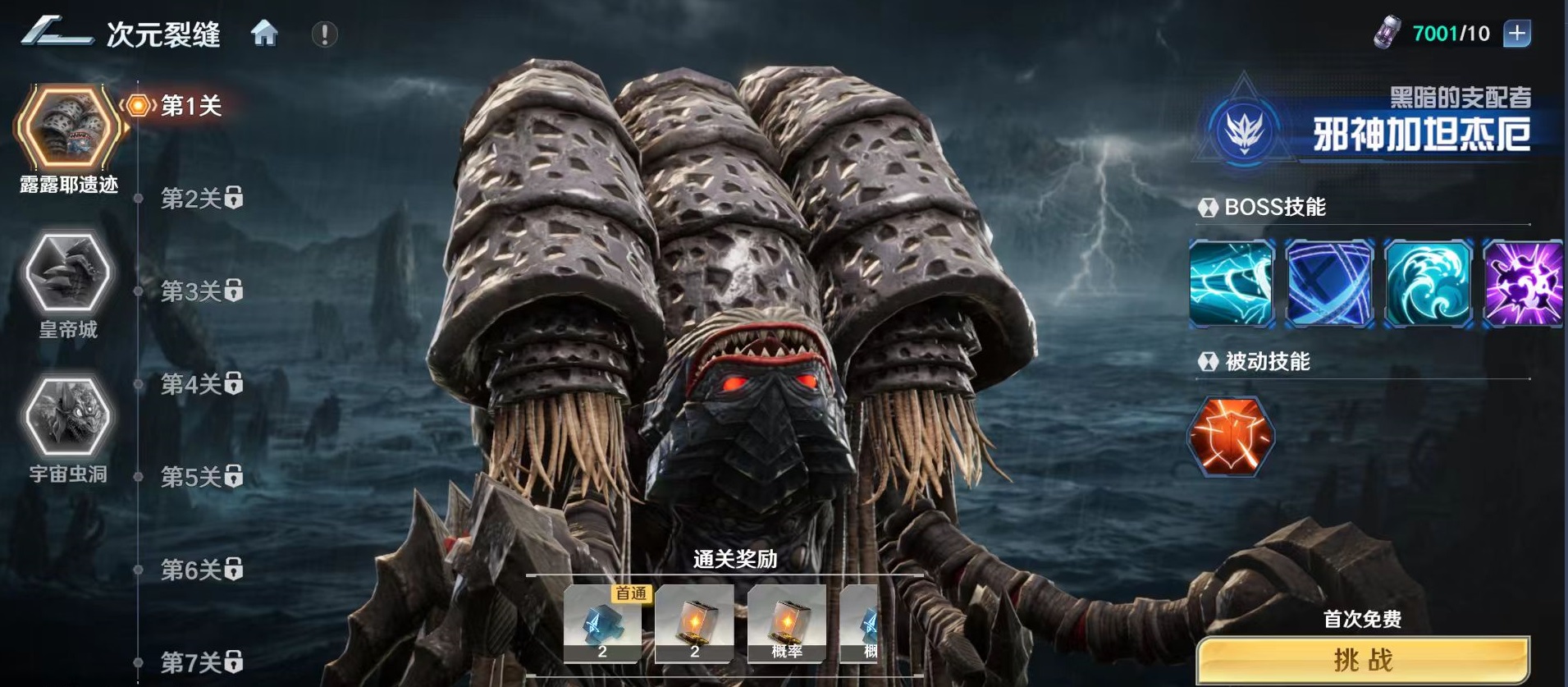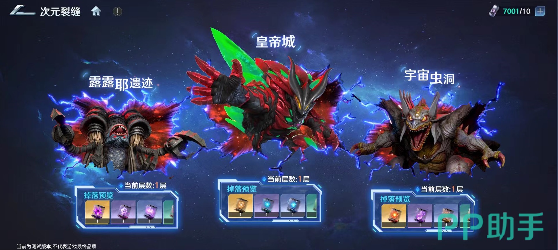 参与“次元裂缝”需角色等级达到25级。活动入口位于主界面【宇宙港】,点击即可直达。当前开放三大主题副本:露露耶遗迹、皇帝城、宇宙虫洞——三者背景设定各异,对应专属BOSS及差异化机制设计。玩家可自由选择任一副本入场,成功击败关卡首领后,将稳定获取角色潜力值、突破材料等关键养成资源。