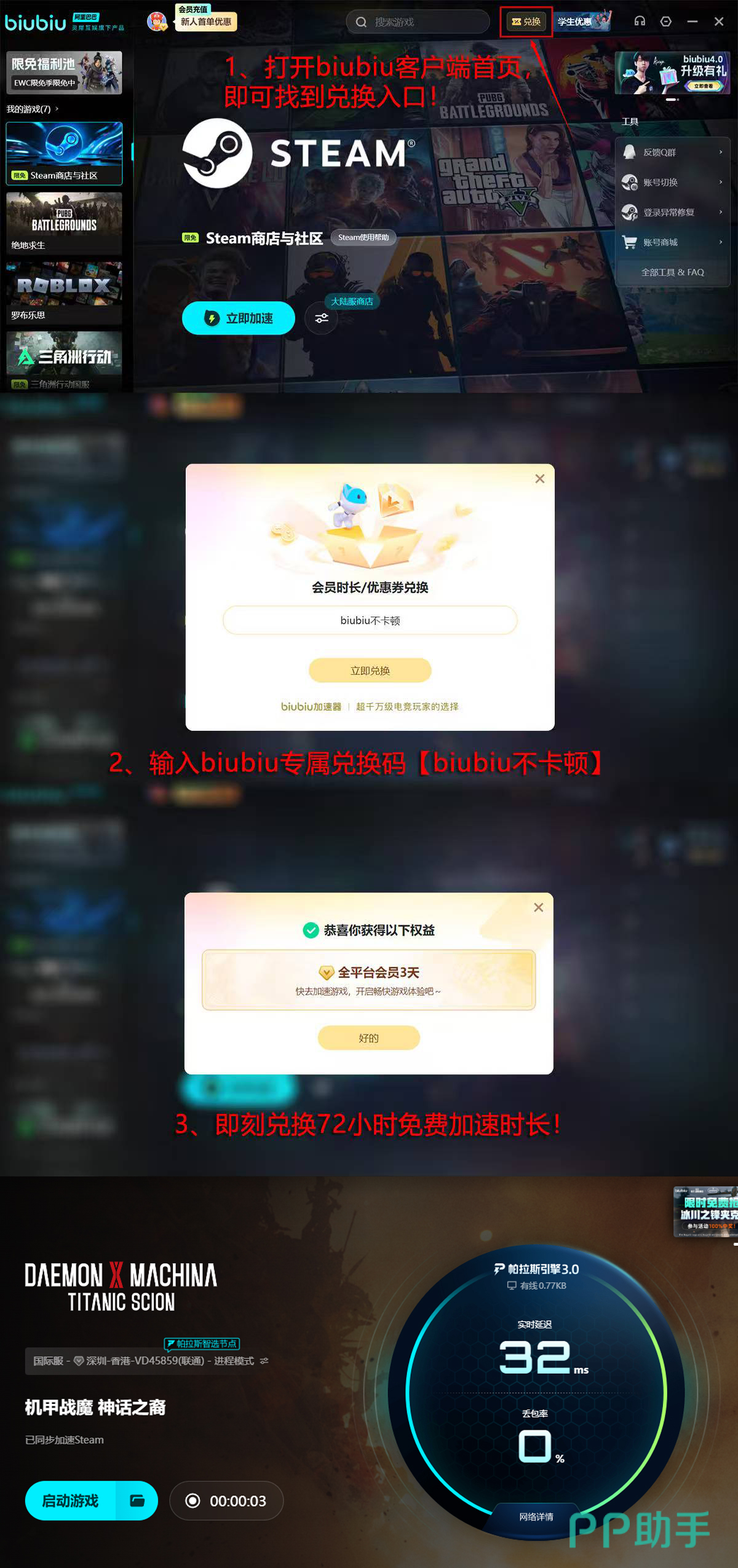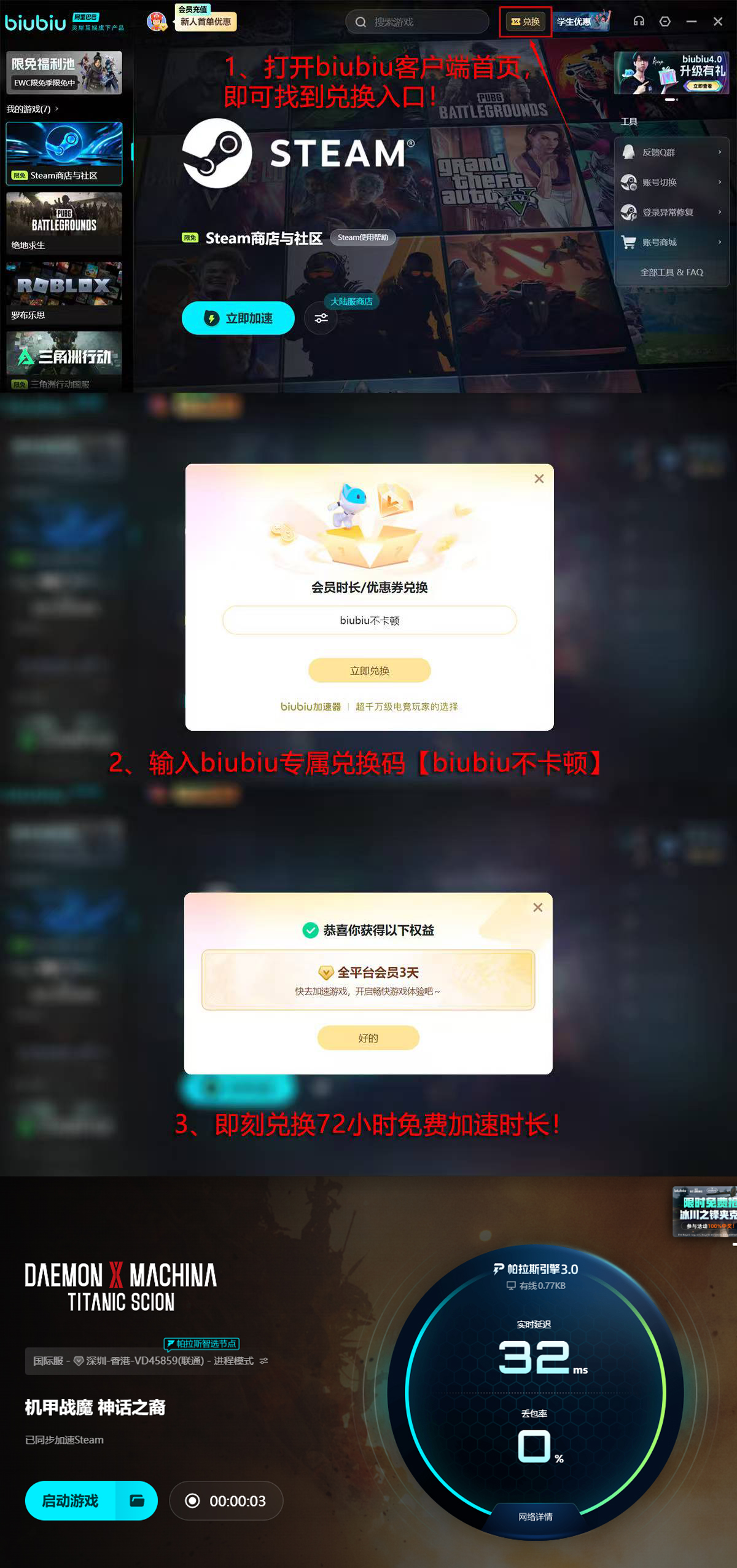 值得一提的是,本次升级特别邀请知名电竞选手Aixleft参与调优测试,共同打造极致低延迟的游戏体验版本。为回馈广大用户,biubiu同步推出多项限时福利:新用户注册即可领取24小时免费时长,同时开放一次性使用的全员口令兑换活动,输入【biubiu不卡顿】可在首页获取额外3天使用权限。两项福利可叠加,新玩家总计可获得长达96小时的免费加速服务。