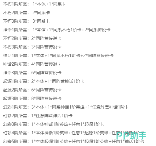 如果游戏里是普通角色,那么升阶材料比较简单。小编列出了普通角色所需材料:不朽1阶所需:1*本体+1*同系卡;不朽2阶所需:2*同系卡;不朽3阶所需:3*同系卡;神话1阶所需:1*本体+1*同系;不朽1阶卡+2*同系传说卡。