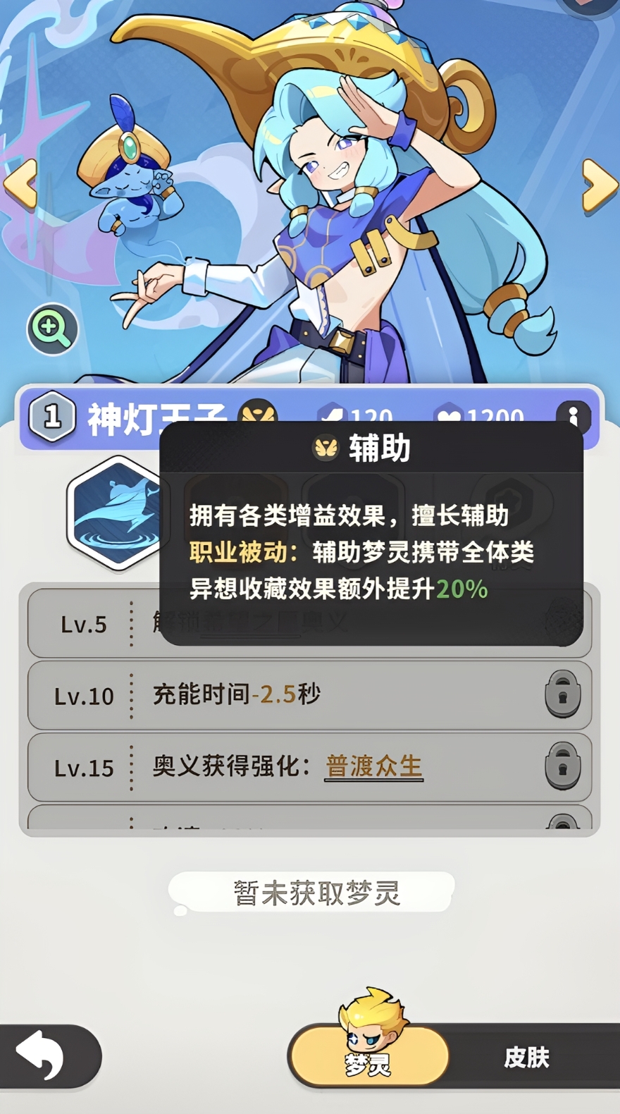 神灯王子是游戏中兼具战术灵活性与战略支撑力的核心辅助型梦灵。他并非传统意义上的纯治疗或纯增益角色,而是以“神灯许愿”为机制内核,实现技能形态的阶段性进化。其基础能力表现为范围性巡回攻击,可在自身安全距离内持续施压;进阶后可延伸攻击半径,并附加灼烧效果。战斗中既可作为独立召唤单位协同主力输出,亦可编入前中后排阵容,提供护盾庇护、负面状态净化及团队士气强化等复合支援,显著提升整支梦灵队伍的生存韧性与输出稳定性。