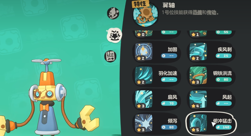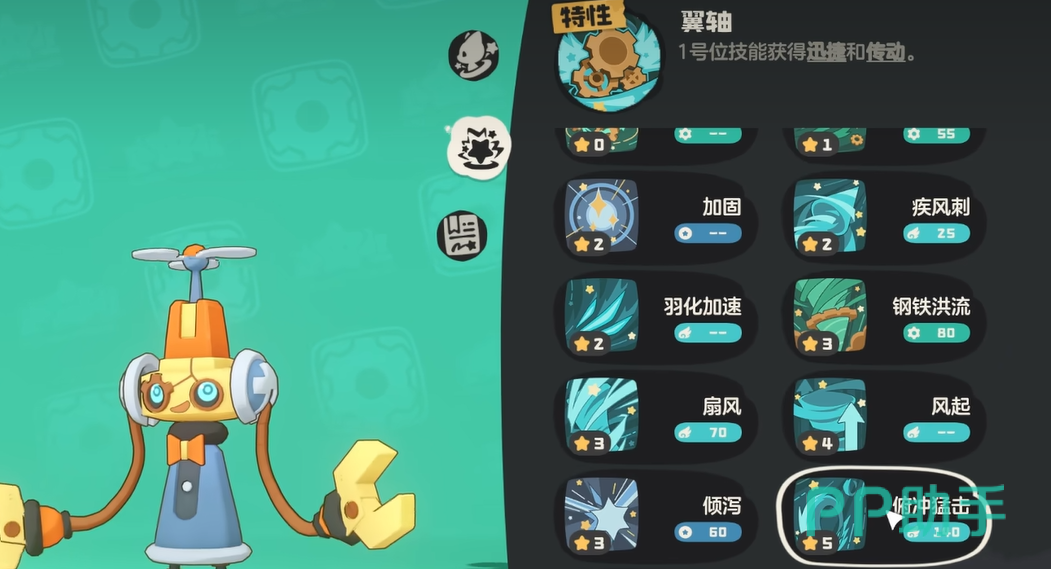 其战场定位清晰:依托九种细别相性的抗性覆盖实现高容错站场,并通过特性“翼轴”强化首发位技能——赋予其迅捷与传动双重效果。其中“传动”指技能在回合结束时自动顺延至下一位置,导致技能栏顺序动态变化,需玩家提前预判操作路径。辅助技能“轴承支撑”置于技能环中可降低相邻技能1点PP消耗,主动触发后更可使邻近技能直接减少2点PP,配合传动机制能有效调控技能释放频次与资源分配节奏。