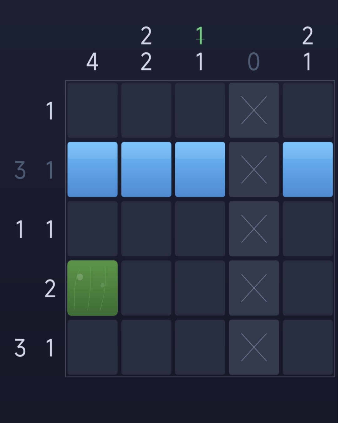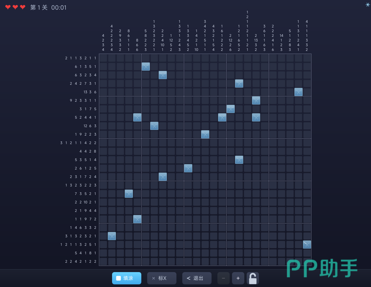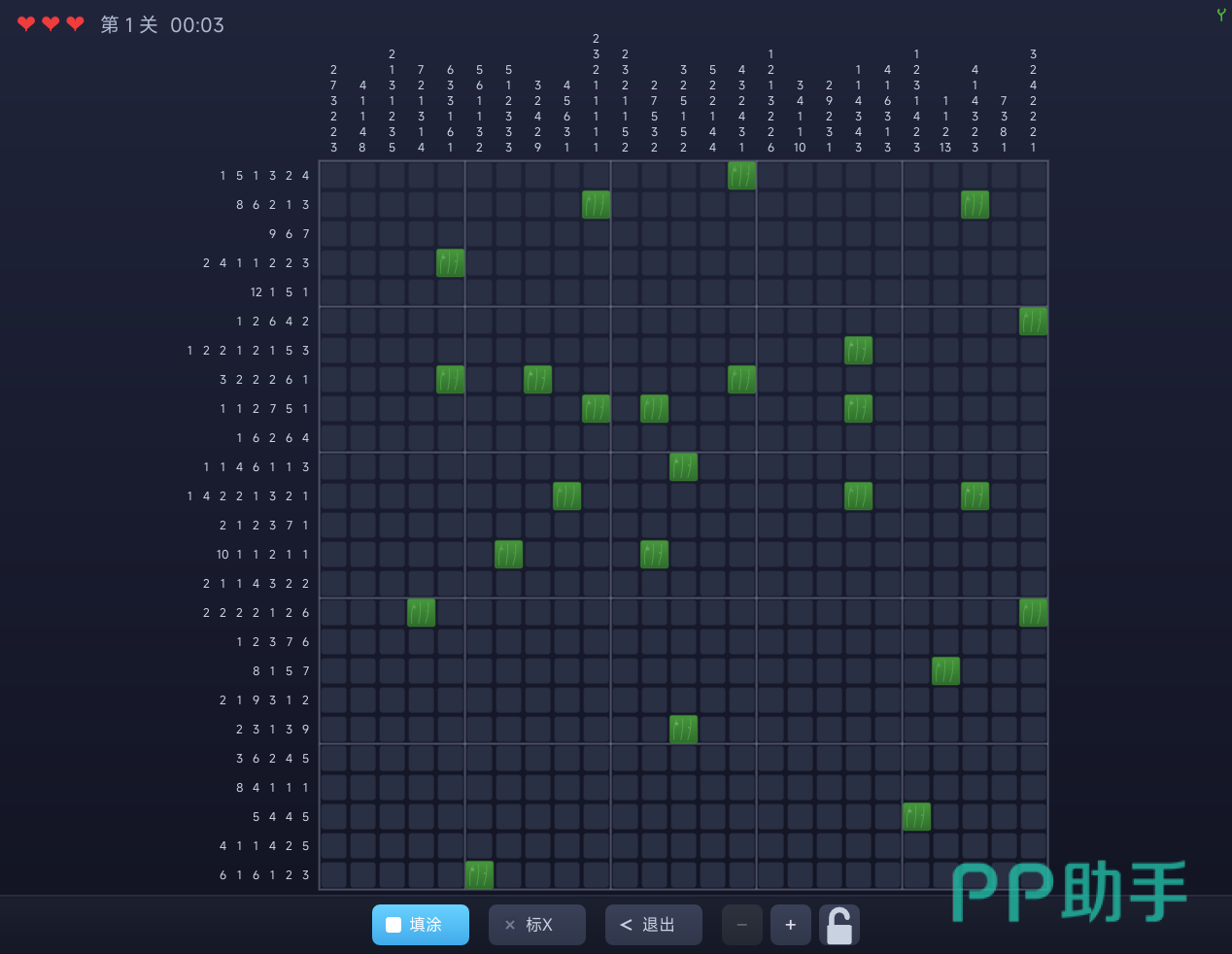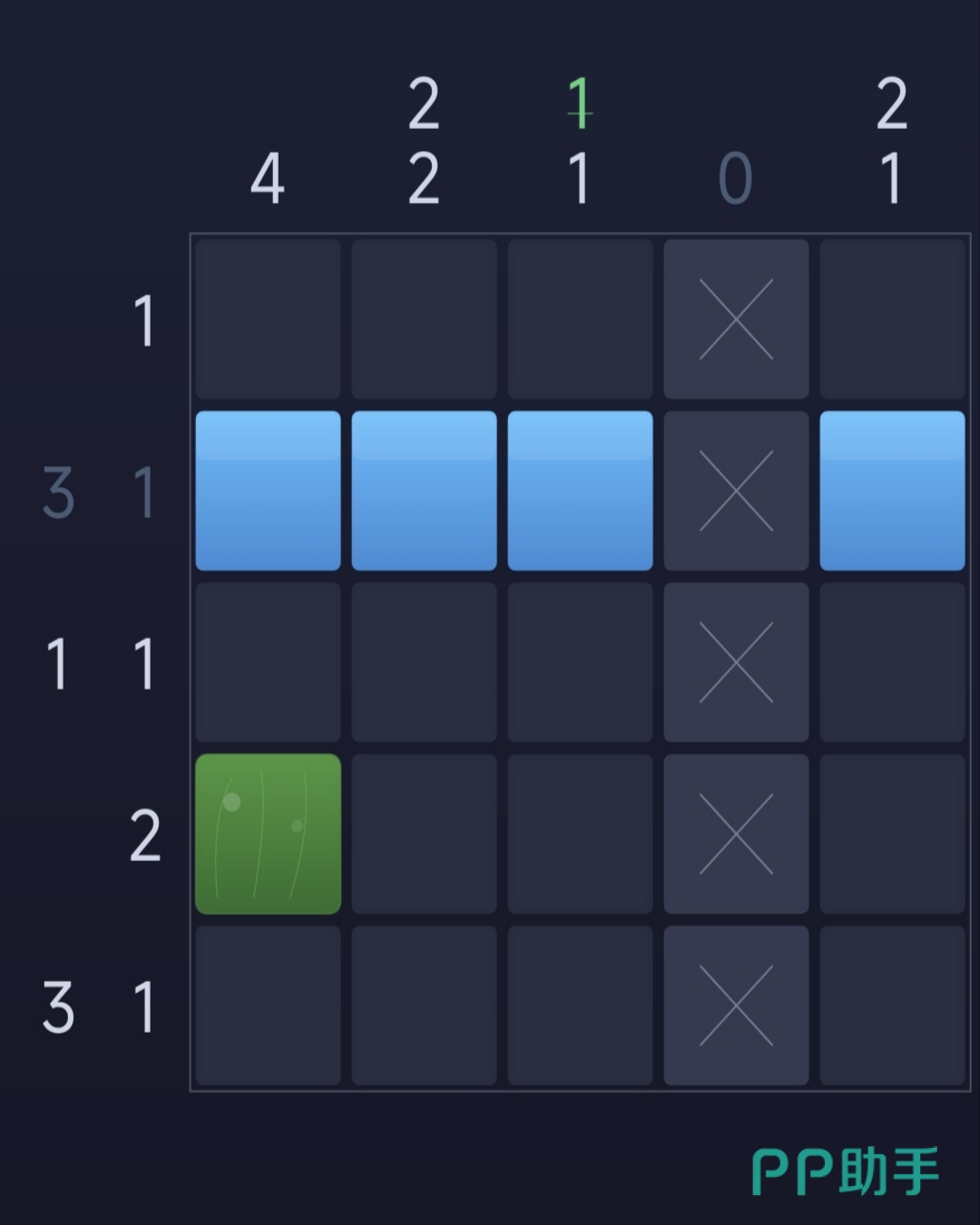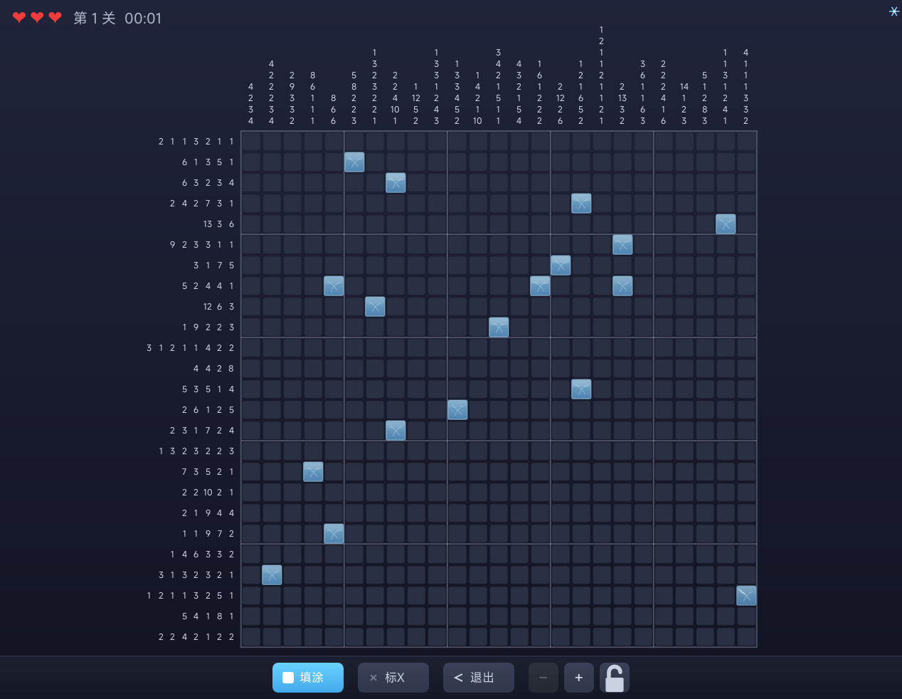 每局挑战提供三次容错机会,任意一格填涂错误即扣除一次;用尽全部次数后判定挑战失败。当某行或某列已达成全部数字提示要求时,系统将自动将剩余未操作格子标记为“X”。此机制还可能触发行列联动——某列因标记“X”而缩小可选范围后,会反向辅助对应行的进一步推理。新手玩家可优先从高数值线索入手,如10格行中出现“6”,其唯一可行位置必然居中偏左或偏右,两端各预留2格作为缓冲,从而快速锁定必涂区域。