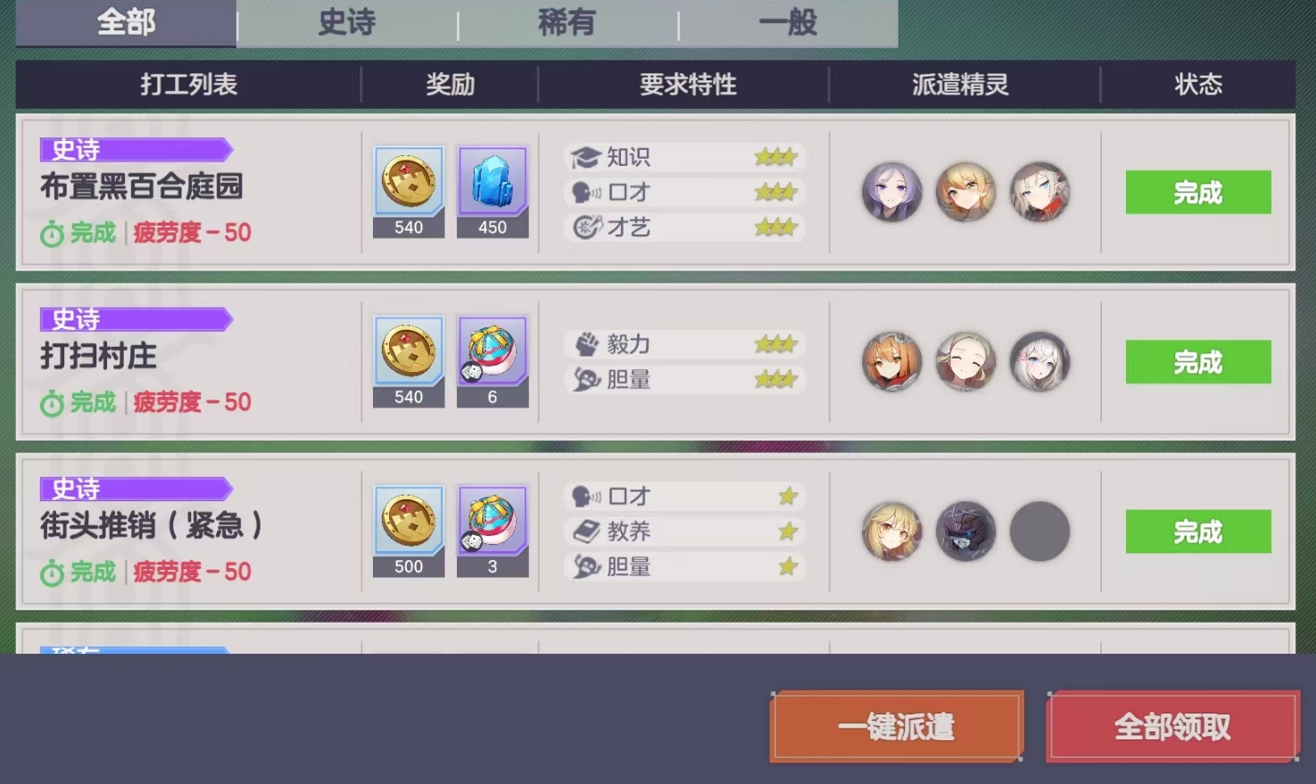 领地系统是游戏中轻量化、低门槛的日常经营玩法。玩家可在个人领地内发布任务,指派已拥有的精灵执行“打工”指令。每次打工消耗固定疲劳值,疲劳值随时间自然恢复,亦可通过休息栏加速回复。打工产出以领地币为主,该货币可在领地专属商店中兑换突破材料、经验药剂、抽卡代币及稀有外观部件。值得注意的是,部分打工任务直接奖励抽奖扭蛋,而扭蛋正是获取精灵好感度道具的唯一常规途径,因此建议优先安排精灵承接扭蛋类任务,以高效推进好感度成长线。