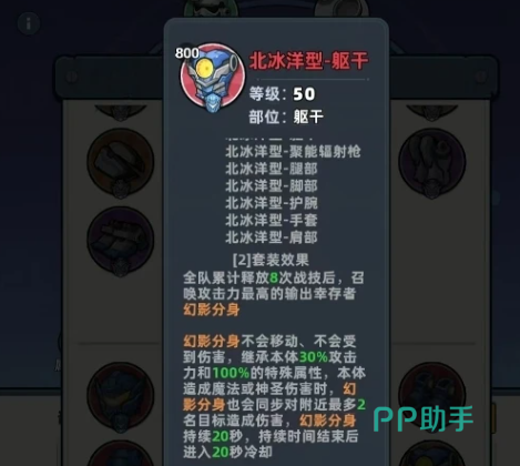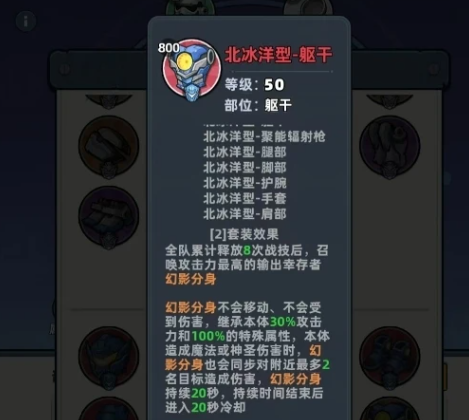 养成节奏需分阶段规划:未通关秘境61层前,可选用高物理攻击或高神圣攻击的过渡型核心装备;一旦稳定获取外骨骼钻头,即可将其作为长期核心,无需再行更换。套装协同是释放其全部潜力的核心环节。经实测验证,最优组合为“北冰洋六件套+擎天行二件套”。北冰洋套装可召唤幻影分身,分身继承本体输出能力与特殊属性,持续20秒且无技能衔接空档;释放战斗技能后,还有50%概率重置冷却时间,大幅提升技能循环频率,从而高频触发钻头的多段溅射效果。