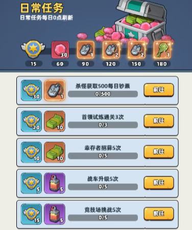 首推必做事项:每日活跃度任务。这是新手期最稳定、回报率最高的基础养成路径。完成全部日常可获得180点活跃度,对应丰厚奖励,其中钻石为全游戏核心硬通货——用于购买士兵识别牌、角斗凭证、罐头密钥等关键道具。特别注意:士兵识别牌是幸存者突破阶段的核心消耗材料,单次突破所需数量较大;角斗凭证则为竞技场入场必需,每日使用上限直接影响可参与场次及最终结算奖励;罐头密钥则是开启罐头副本的准入凭证,该副本为中后期主力资源产出渠道之一。