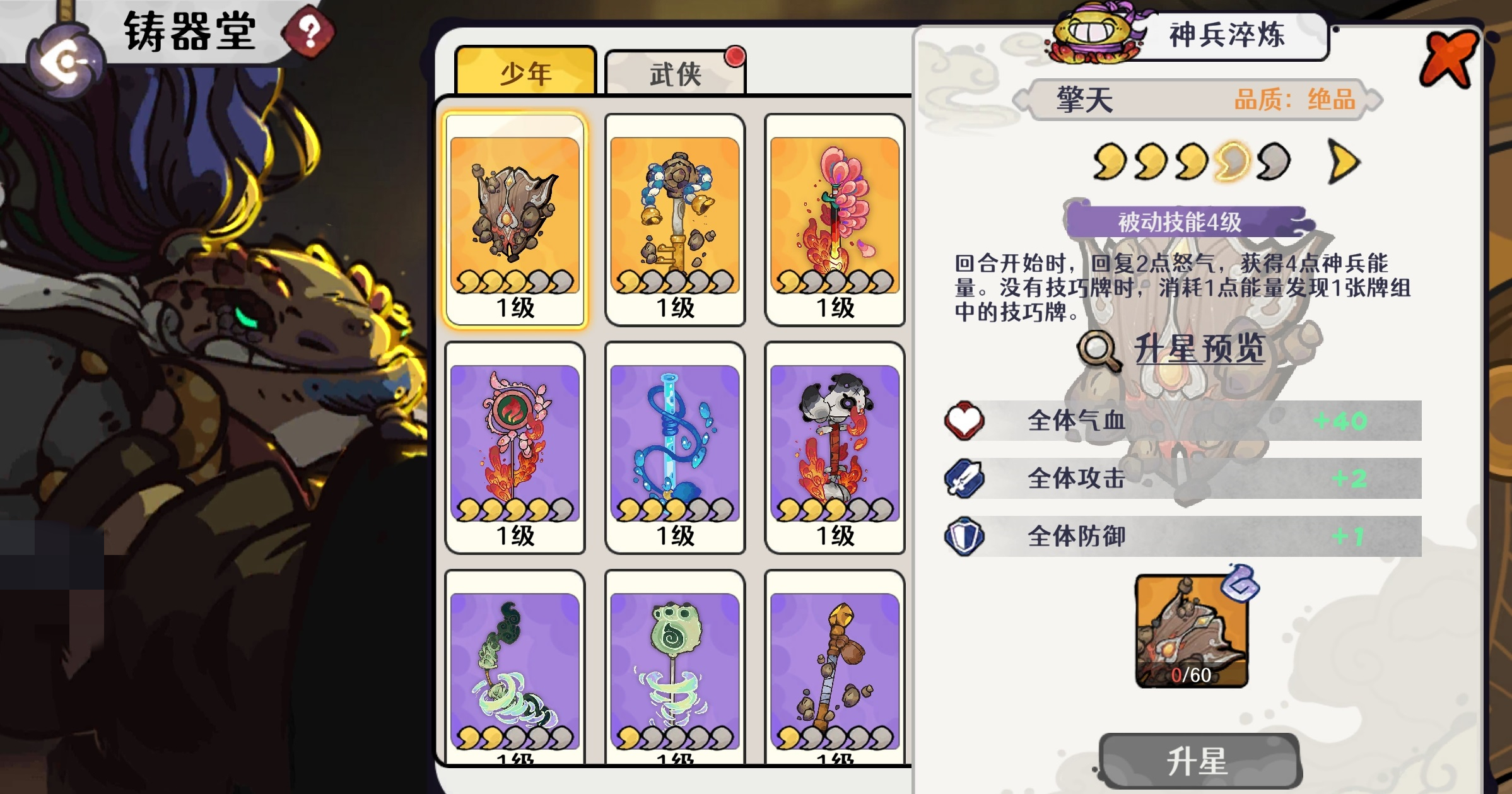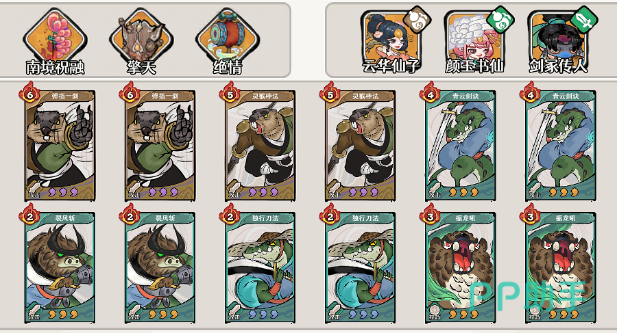 在角色配置层面,推荐采用剑冢传人、云华仙子与颜玉书仙组成三侠阵型。此组合兼顾生存韧性与输出弹性:双辅助角色提供持续治疗保障,剑冢传人承担主力输出及卡组调度职能。卡牌构筑上,必备弹指一刹(过牌)、裂风斩(风系直伤)、独行刀法(怒气转化)、振龙吼(回怒);神兵选择擎天为最优解,其余神兵可根据实际资源灵活替换。队伍站位与卡组结构可参照图示布局,其中云华仙子与颜玉书仙具备功能互换性,便于应对不同关卡环境。