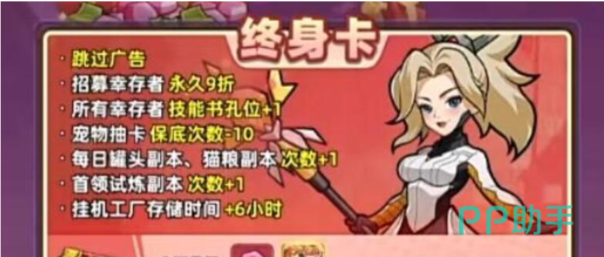 终身卡面向深度玩家设计,权益包括广告屏蔽、稀有角色购买折扣15%、额外宠物槽位+1、副本次数上限提升至每日5次,以及宠物抽取保底次数降低至80抽(原120抽),综合价值适配长期留存用户。
