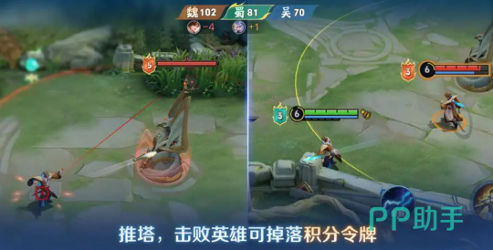 这次的“血战华容”是一场与众不同的5v5v5三角地图对抗。每个阵营不仅要应对敌对阵营的冲击,还得面对“合纵连横”的战术安排。简单来说,战斗不仅仅是击败敌人这么简单,你还得时刻关注积分的变化,计算何时能一举逆袭,何时又得联盟以求共赢。击败敌人、摧毁塔楼都会掉落积分令牌,队友们拾取后能为自己的阵营加分,为了胜利,甚至要跨越艰险迎接挑战。