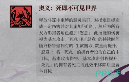 至于她的奥义——死即不可见世界,更是她最具压制力的技能之一。齐格鲁娜释放的怨灵集群会对指定目标造成伤害,并施加“死兆”效果,这让敌人不得不在短时间内面对极大的生死威胁。同时,齐格鲁娜还会为所有友方影猎者施加“怒意”增益效果,大幅提升其输出能力。敌人在“死兆”效果下的弱点暴露无遗,而“怒意”则使得齐格鲁娜和她的队友能够迅速消灭目标。