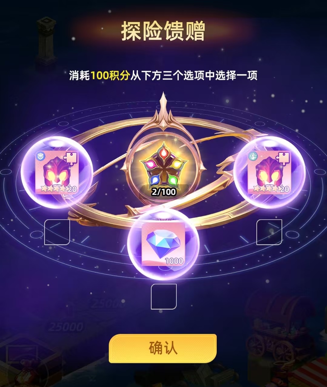 除探险积分外,另一套独立成长体系为星盘点数。每次掷骰固定获得2点星盘点数,累计满100点即可在遗迹星盘中兑换指定奖励。星盘常驻奖励包含五星级英雄碎片、钻石等高价值道具,且兑换不设冷却、无需额外操作,属于纯粹的被动积累型收益。只要保持日常骰子消耗频率,即可稳定获取,适合各类玩家长期参与。