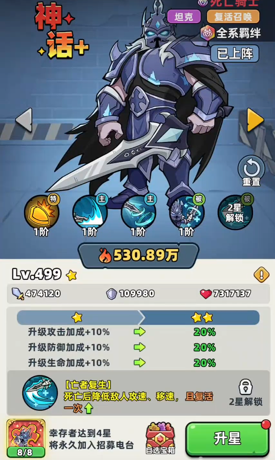 在《生存33天》这款策略生存类手游中,角色强度直接关系到副本通关效率与队伍构建上限。其中,死亡骑士作为神话品质角色,凭借独一无二的“被动复活”机制成为当前版本T0级前排核心——其基础设定为:每次阵亡后可立即满血重返战场,且该效果可随星级提升解锁额外复活次数,是全游戏唯一具备稳定、可控、可成长型复活能力的角色。