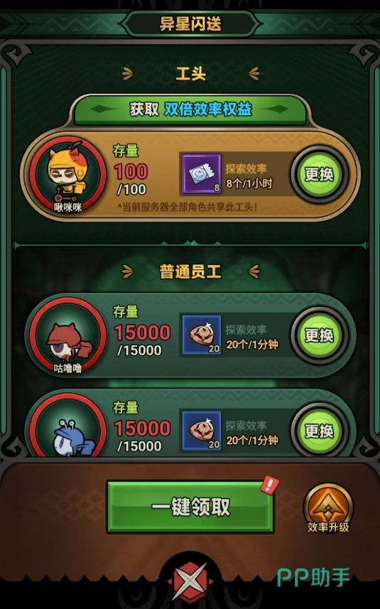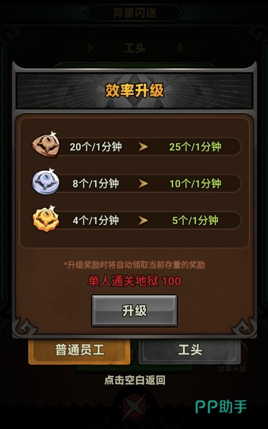 每位员工在同一时间只能专注于某一类瞳币的收集,因此在分配任务时需合理规划所需资源类型与数量,防止因某类资源短缺影响整体升级节奏。若需调整策略,可通过点击员工及工头旁的“更改”按钮,重新设定目标瞳币种类。另外,提升获取效率需依赖关卡进度:首次效率升级需通关地狱60,第二次则需达成地狱100。每当突破这两个节点后,请务必返回异星闪送界面,为员工和工头更新工作效率。