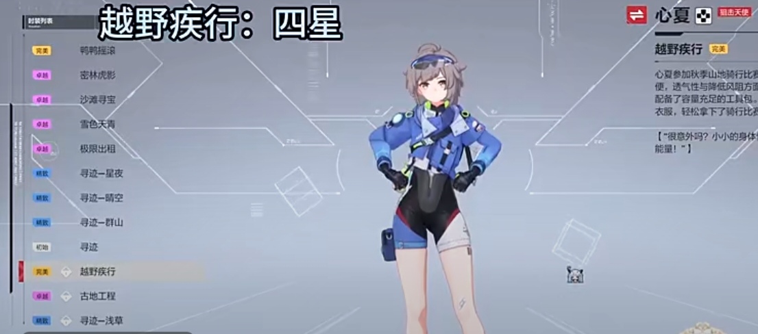 这个皮肤是心夏去参加骑行比赛时的穿着打扮,这是一套比较适合秋日的皮肤,衣服整体极为贴身,而且衣服还极为轻便,它有着良好的透气性,穿上它在去比赛时可以通过降低风阻的方向而获得优异的成绩。