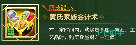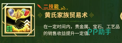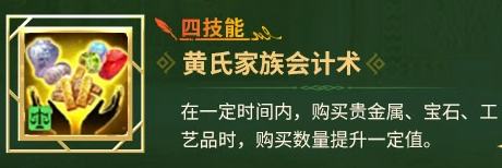 贸易协同技能组构成完整商业闭环:二技能「黄氏家族贸易术」提升贵金属、宝石、工艺品三类高价值货物的售出单价;四技能「黄氏家族会计术」则同步提高上述品类的单次采购上限。二者联动可大幅提升单次贸易循环的利润总量与物资周转效率,尤其适配专注区域套利、港口差价经营及稀有资源囤积的玩家流派,大幅降低对贸易属性词条装备的依赖度。