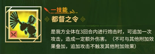 核心战斗技能「都督之令」可在3回合内使己方全体炮击行动额外触发一次基础炮击,该追加攻击不参与任何效果链式触发(如暴击判定、连携增伤、状态附加等),亦不可与其他同类增益叠加。该机制强调策略适配性——在未配置多重触发类技能或装备的阵容中启用,可稳定提升单位时间火力密度,避免资源浪费。