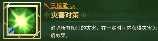功能型技能「灾害对策」提供双重海上安全保障:立即清除编队内所有船只当前所受的风暴、迷雾、触礁、瘟疫等灾害状态,并赋予持续性灾害免疫效果。该技能在高难度远航副本、跨海域探索及限时事件关卡中具备不可替代的容错价值,显著降低突发环境风险对航行进度的影响。