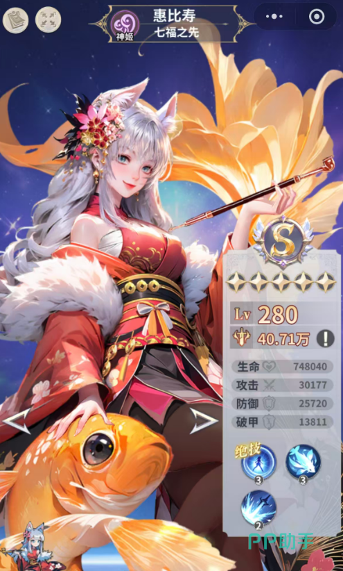 惠比寿作为神姬分支代表,拥有独特的海洋吞噬机制。当敌方目标当前生命百分比低于10%时,她可直接吞噬并封锁其行动;若敌方生命高于自身,则触发280%物理伤害。其被动技能提供全队8%防御力加成,且每次成功吞噬敌人后,永久提升自身10%伤害减免,最高可达40%。该机制不仅强化生存容错,更赋予其针对残血单位的精准压制能力。