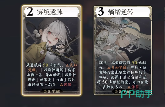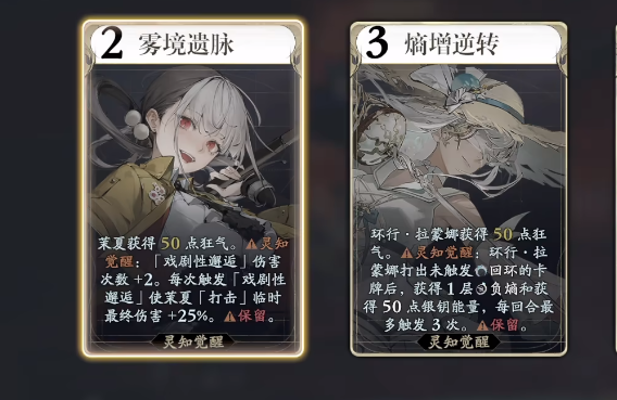 茉夏拥有双重天赋机制:基础天赋“追击响应”——当玩家在一回合内打出两张打击卡时,自动触发一次追击,造成相当于茉夏攻击力30%的随机伤害,该效果每回合最多触发四次;篇章天赋“灵塑适性”则强化对主宰类敌人的压制能力,对其伤害提升20%以上,同时使所有唤醒体的打击伤害提升15%至35%,且每当敌方单位被击败,茉夏立即获得20至510点狂气值。
