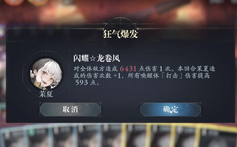 当“龙卷风世界大崩溃”状态被激活后,茉夏获得增伤叠加效果,且每场战斗均稳定触发死亡抵抗机制;此时“风暴冲击”的算力消耗归零,首次释放即令全体敌方单位陷入昏迷,丧失当回合行动权。“雾境遗脉”作为其灵知觉醒技能,初始即赋予50点狂气,并在战斗中额外激活两次;此后每次使用打击卡,均可为对应目标施加25%的临时最终伤害增益。