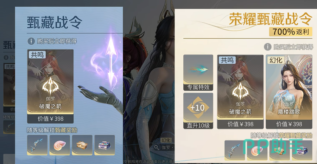 本期战令共设两个档位:售价68点券的高级战令,以及售价168点券的升级战令。二者均可解锁伽罗英雄及对应专属皮肤,但皮肤表现存在明显差异——高级战令所赠皮肤为基础款,仅含常规特效;升级战令则额外附赠幻化皮肤,拥有更丰富的动态效果与视觉层次。此外,升级战令开通即自动升至10级,可立即领取幻化皮肤特效,而高级战令需玩家手动完成任务升级后方可解锁皮肤相关权益。其余资源类奖励(如铭文碎片、英雄碎片、荣耀积分等)在两档战令中基本一致。