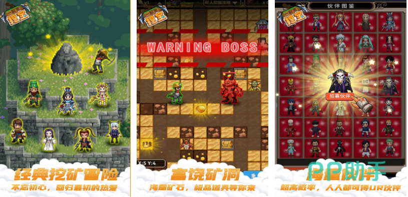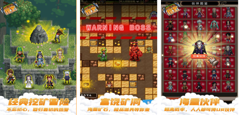 一起来挖宝是个具有像素画面表现的模拟挖矿游戏,挖矿洞探索宝藏的游戏理念随机性很强,经典挖矿冒险的具体玩法也让玩家回味无穷,富饶的矿洞内部有着超多宝藏资源等你寻找,各种能力各异的伙伴也会伴随大家一起挖掘,探索矿洞的同时会随机遇到各种BOSS敌人,像素粒子的精致美术表现无疑带来视觉享受。
