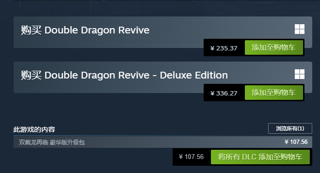 目前,《双截龙再临》提供两个购买选项:标准版定价为235.37元,包含完整的基础游戏内容;另一个是豪华版,售价336.27元,在标准版的基础上额外加入了限定内容——双截龙躲避球模式,适合希望获得更丰富体验的玩家选择。
