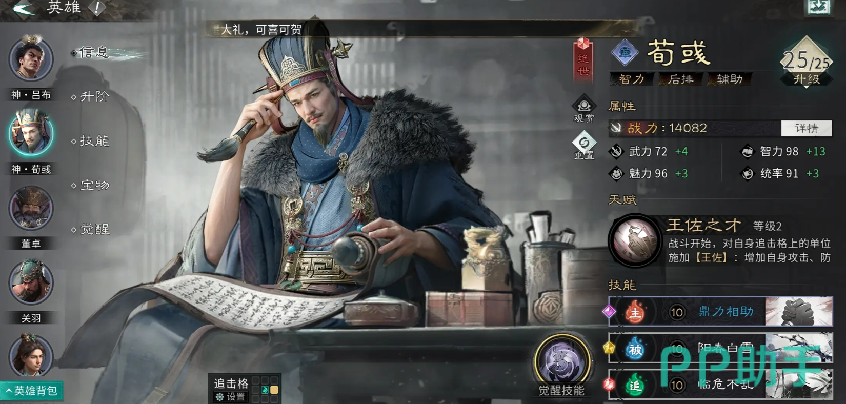 第二位是荀彧。他承担着群体控场与环境构建的双重职能。其战法具备高谋略伤害与稳定附加效果,可高频触发【混乱】与【禁疗】等复合状态。尤其在搭配【大赏三军】后,开局即提供全队谋略增益,大幅提升后续控制技能的命中率与持续时间。当荀彧与贾诩形成联动时,前者制造的混乱状态可进一步放大后者【机谋巧变】的触发收益;而混乱目标在攻击逻辑紊乱下,往往出现误伤友军或空放技能的情况,极大削弱敌方战术执行力。此外,其重伤类战法亦能有效抑制敌方恢复能力,巩固控制成果。