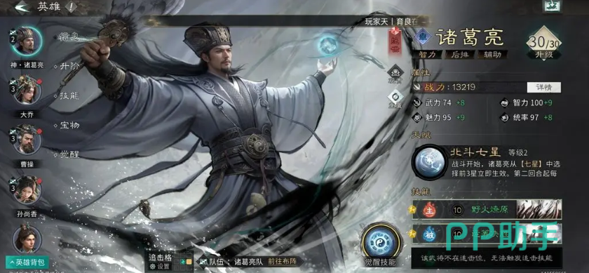 第三位是诸葛亮。他在本阵容中担任控场深化与反制补足角色。主动技【机谋巧变】除常规控制外,额外附带约32%基础攻击力的固定伤害,并基于智力属性提供20%概率施加前置控制效果;追击技【反制】则可在反击时以50%概率附加混乱,使敌方单位在混乱状态下失去攻击目标判定,甚至攻击己方队友。其被动技【兵不厌诈】在受到伤害后可立即激活,提供高达40%的伤害增幅,且该增益随控制命中次数叠加,形成“控得越准、打得越狠”的正向循环。三者协同下,敌方单位常在2–3回合内陷入多重负面状态叠加,彻底丧失操作空间。