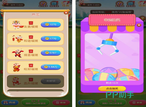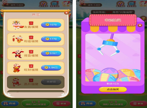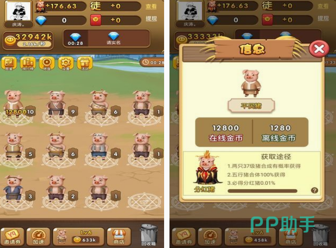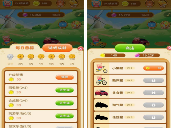 此游戏也是结合了合成,这种玩法的经营养猪场手游,开始的时候小猪,只是等级非常低的猪,但是利用不断购买新的猪,然后合成等方式,可使猪的等级提升,获得的收入也会越来越高。如果你也想成为一个养猪大佬的话,这款轻松又益智的休闲游戏,让你享受不一样的游戏体验,里面的小猪还穿着各种各样的服饰,仿佛是西游记当中的猪八戒。