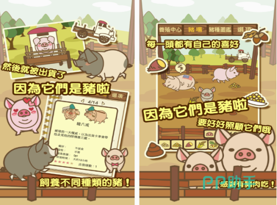 这款游戏不仅能帮助大家,与其他的玩家一较高下,看看谁养殖的猪数量多,还将猪分为了不同的类型。除了普通的还有稀有的猪,在价格方面稀有的猪价格会更贵一些,可通过狩猎主宰的方式,来获得相对于单纯的农场经营游戏。还能对猪仔进行狩猎,增加了游戏的可玩性,要养殖不同类型的小猪,然后不断的扩大规模。