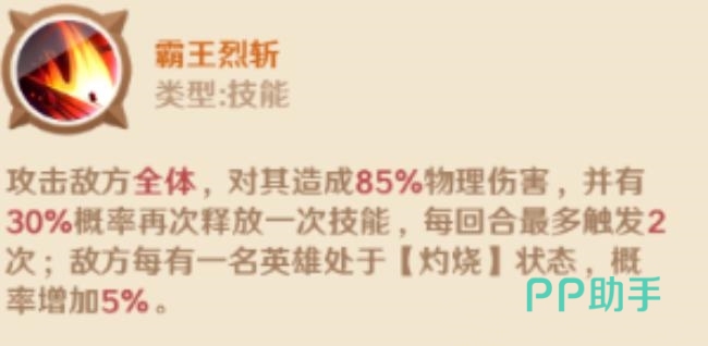 孙策的主动技能可对敌方全体造成伤害,并存在重复释放机制:每有一名敌方单位处于灼烧状态,该技能二次释放概率提升5%。当敌方五人全部被挂上灼烧时,二次施放概率可达60%,实现稳定双段AOE输出,极大压缩对手生存空间。