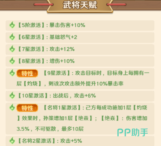 其天赋体系围绕灼烧层数构建:敌方每存在1层灼烧,孙策暴击率提升10%;达成1星后,我方任意武将施加灼烧时,孙策自动获得1层“绝焱”效果,每层提升3.5%伤害,最多叠加10层;升至3星后,绝焱叠满4层可获得50%爆伤加成,叠至8层则触发生命回复;当孙策晋升为神将并激活1星时,若其释放技能时目标带有灼烧,则立即引爆该状态,额外造成一次高额范围伤害。