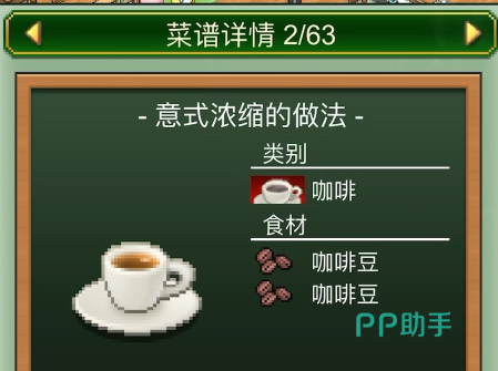 大部分食谱需要通过完成任务逐步解锁,也有部分需要玩家自行探索合成方式。首先来看基础饮品——咖啡。制作一杯普通咖啡需使用两份咖啡豆作为原料。不同类型的咖啡对材料有特定要求:例如拿铁咖啡除了咖啡豆外,还需加入牛奶;而摩卡咖啡则由咖啡豆、巧克力酱以及咖啡豆装饰物组合而成。只有集齐所需材料,才能成功研发并上架该饮品。