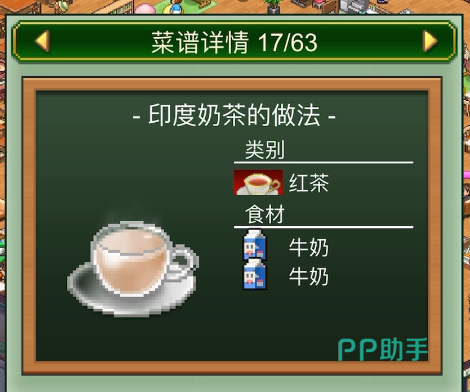 除了咖啡系列,红茶类饮品也是菜单中的重要组成部分。柠檬茶的主要成分为柠檬;生姜红茶则依赖生姜作为核心原料;印度红茶的配方较为特别,需要双份牛奶调制而成。苹果茶由苹果和蜂蜜混合制成,口感清新甘甜。冰奶茶的制作相对简单,主要原料为牛奶。进入游戏中期后,热饮需求上升,抹茶拿铁和可可等暖饮成为顾客喜爱的选择。