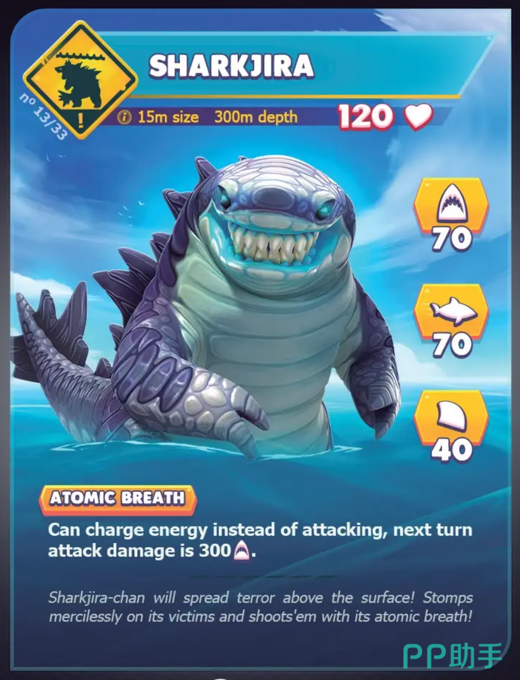 鲨斯拉是饥饿鲨进化非常强力的一种鲨鱼,但是由于血量只有120,所以建议大家还是要多多练习,不然低血量很难保证我们的激光炮的能量积累。但相信通过小编的分享大家已经掌握了它的基本玩法,一定能够拿到更高的分数。