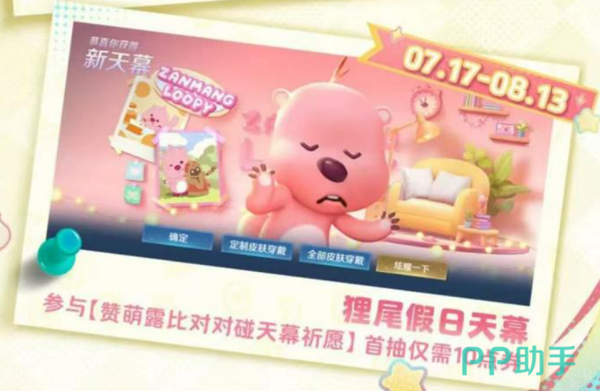 配合本次联动主题,游戏还上线了一系列粉色系视觉内容。从7月17日开始,玩家可通过参与天幕祈愿抽奖活动,有机会获取名为“粉色狸尾假日”的全新天幕。这款天幕以温暖柔和的粉色为主色调,营造出轻松、浪漫的视觉氛围,非常适合搭配Loopy主题皮肤使用,整体观感统一而细腻。