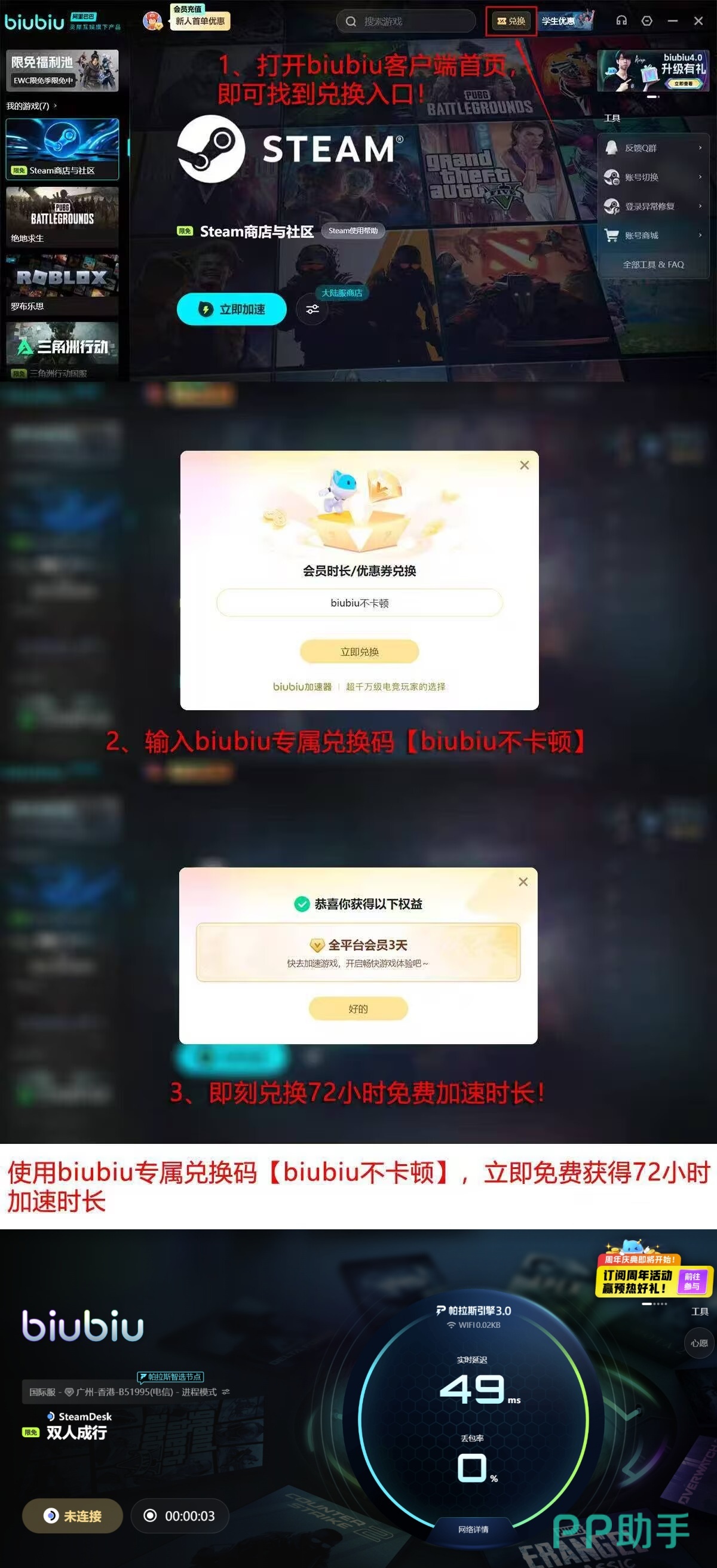 产品在性能优化的同时兼顾易用性设计。平台开放通用兑换口令【biubiu不卡顿】,用户按规范输入全小写字符即可领取72小时免费加速时长;所有支持游戏列表内项目均可无门槛使用加速服务;新注册用户完成登录流程后,系统将自动发放24小时首登体验权限。