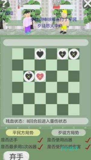 《正当防卫棋》这正是一款别出心裁的游戏,在棋类游戏当中已经脱颖而出,每一个棋子在游戏过程中都能够发出很让人不敢相信的力量。现在可以分为平民、歹毒两种阵容,任由玩家选择。平民的一方要采取防卫的方式去防止歹徒攻击,每一个棋子的体力值都是有设定的,要随时观察自己的体力值变化。合理的利用才能够攒足更多的力量,才能防歹徒在进攻的时候及时的控制,谁的体力线消失之后就代表另一方已经成功。