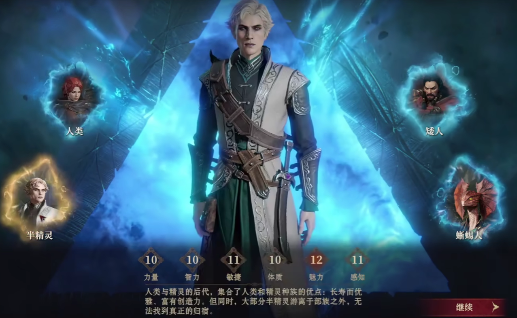 半精灵族在游戏当中拥有最高的魅力数值,魅力数值高达十二点,力量值、智力值、体质数值都为十点,敏捷和感知方面,具体数值为十一点,半精灵在游戏当中拥有最高的身高,并且外观方面,也是较为唯美的。
