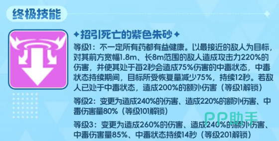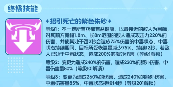 终极技能“紫色朱砂·招引死亡”覆盖前方38米×1.8米矩形区域,对范围内全体敌人造成200%基础伤害,并附加高强度中毒——每2秒造成75%攻击力的持续伤害,且在此期间敌方治疗效果下降75%。这一减疗机制使其在对抗高续航阵容时具备战略级反制能力,大幅压缩敌方恢复窗口,加速战斗节奏。