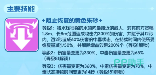 瑞贝卡的一技能“黄色朱砂”具备强控场与强削弱双重特性:对最近目标发动水压喷射,造成300%基础伤害,并在12秒内每2秒触发一次60%伤害的中毒效果;同时使目标回复量降低50%,并清除其身上最多200%数值的增益效果。该技能兼具爆发、持续输出与团队辅助价值,是衔接连招链的核心起手技。