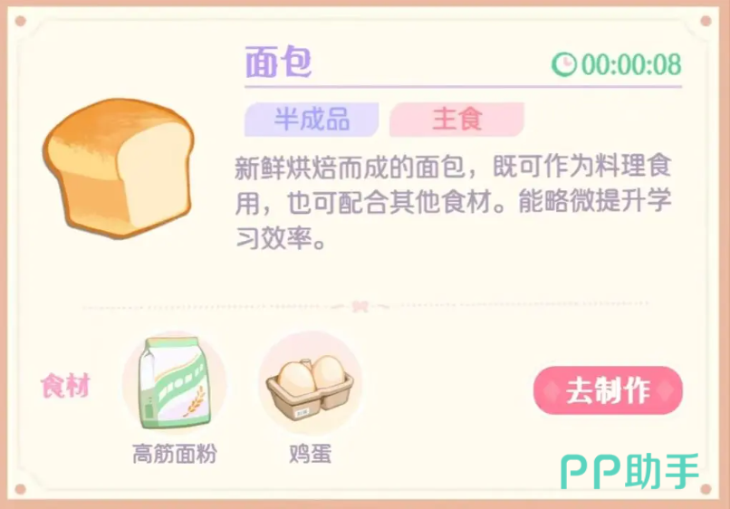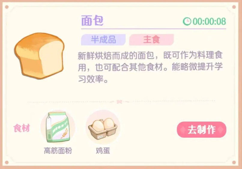 面包在游戏当中可以充当半成品,也可以充当成品,它需要玩家使用一份高筋面粉和一份鸡蛋制作完成。