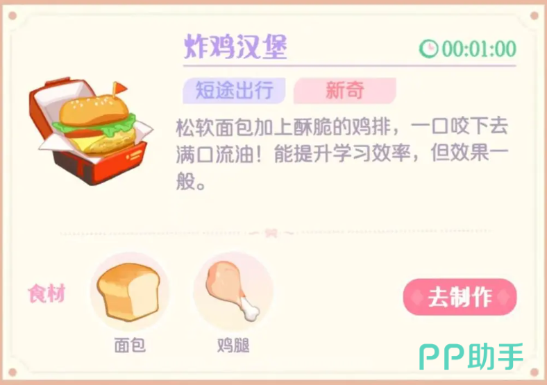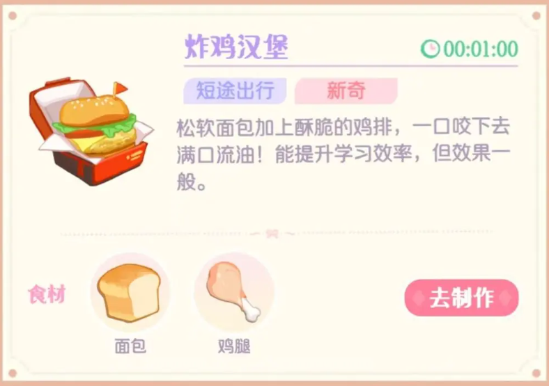 炸鸡汉堡在游戏当中,只需要消耗一份面包和一份鸡腿即可,需要一分钟的制作时长。
