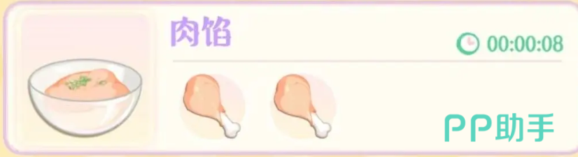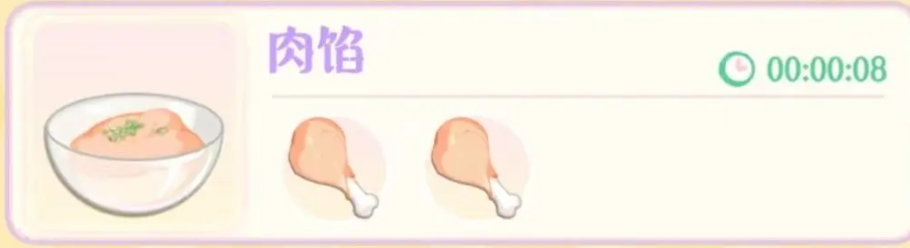 面团需要玩家使用两分高筋面粉,烘焙八秒钟即可制作成功,而肉馅,需要玩家使用两枚鸡腿,通过打磨,制作八秒,就能够获取了。
