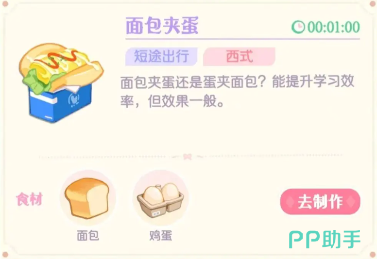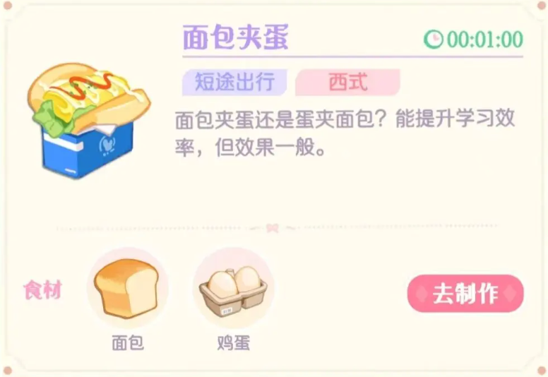 面包夹蛋需要玩家使用一份面包和一份鸡蛋,总共需要消耗玩家一分钟的时间。