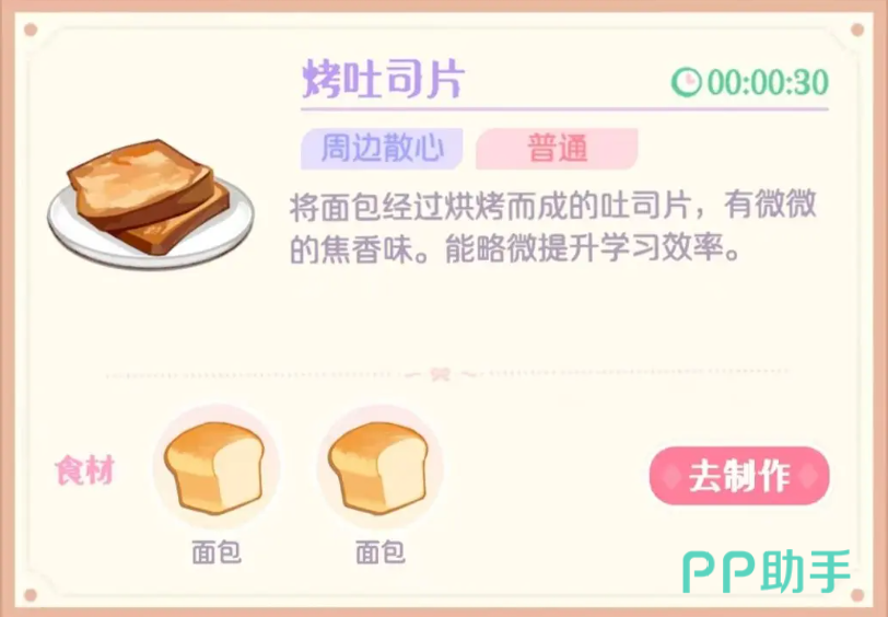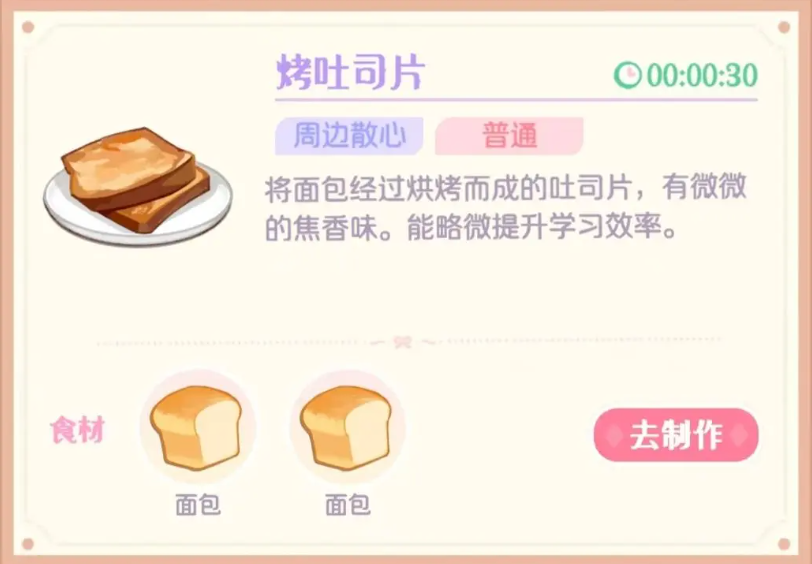 烤吐司片需要玩家消耗两份面包,烘焙30秒钟才能够制作成功。