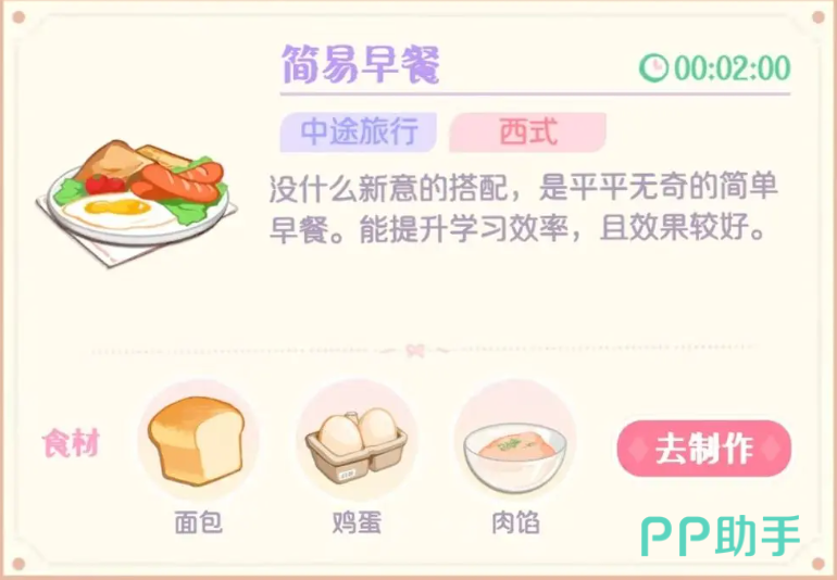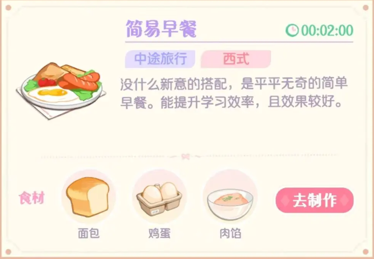 简易早餐需要玩家消耗一份面包、一份鸡、一份肉馅才能够制作,总共需要消耗两分钟。