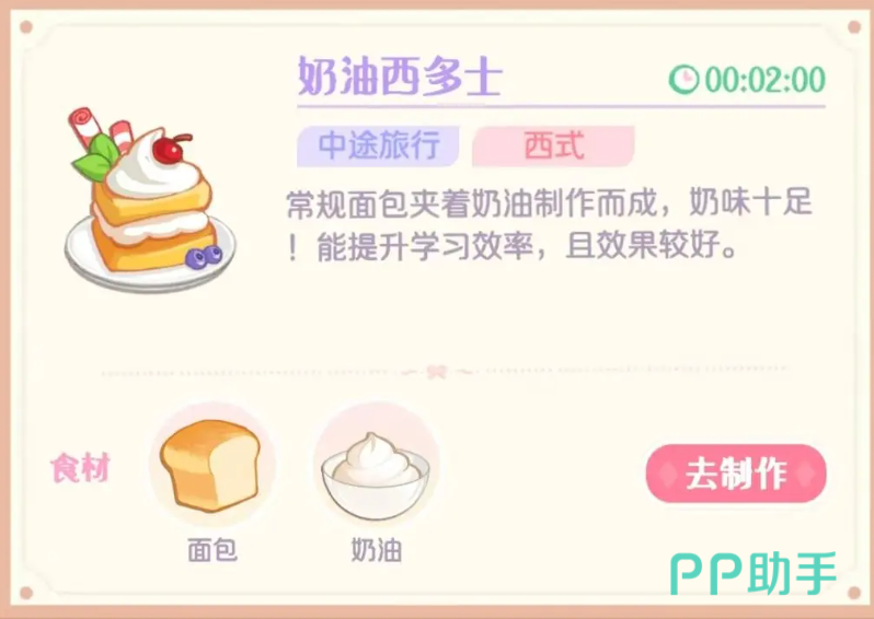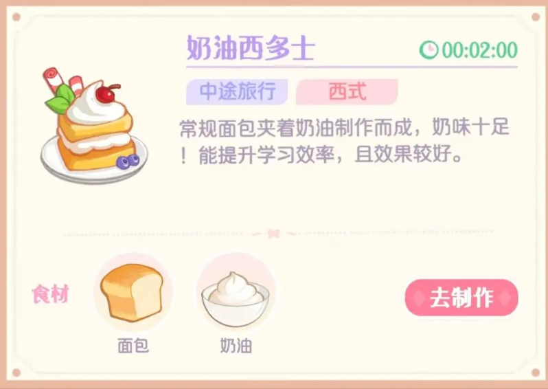 奶油西多士在游戏内,只需要消耗一份面包和一份奶油就可以制作成功了,并且它还是中途旅行的最重要食材,在游戏当中性价比是非常高的,但由于它需要制作两分钟的时间,所以建议玩家提前备餐。
