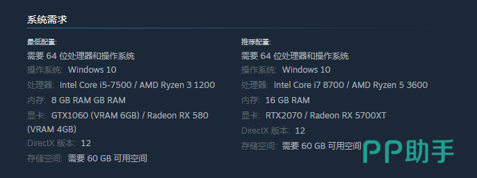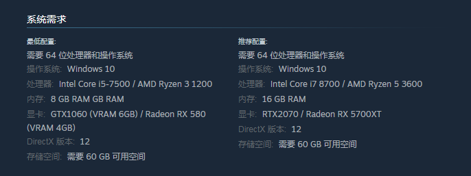 操作系统可以选择 Windows 10,处理器可以选择AMD Ryzen 3 1200,在内存上也需要有所保证,可以关注8 GB RAM,另外在选卡这方面也需要注意,可以选择GTX1060 (VRAM 6GB)。
