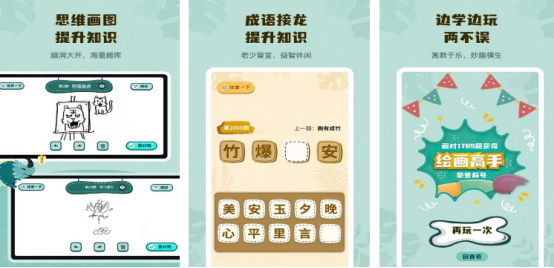 以成语为主要题材,还以多样化的玩法将成语的故事叙述的淋漓尽致,其中包括的关卡内容特别多,系统会随机给出不同的题目,玩家要根据具体的题目通过作画的方式,生动地描绘出所给出的题目,而另一位玩家就需要进行猜测,直至猜到正确成语为准,此游戏比较考验彼此的默契感。还包含不同的玩法,比如成语接龙以及思维画图等等,学习娱乐两不误。
